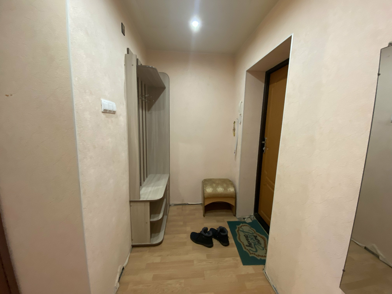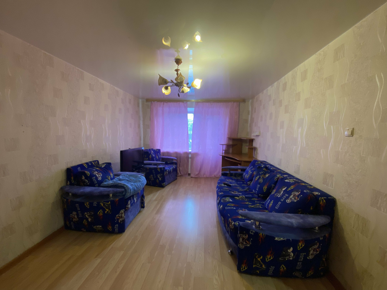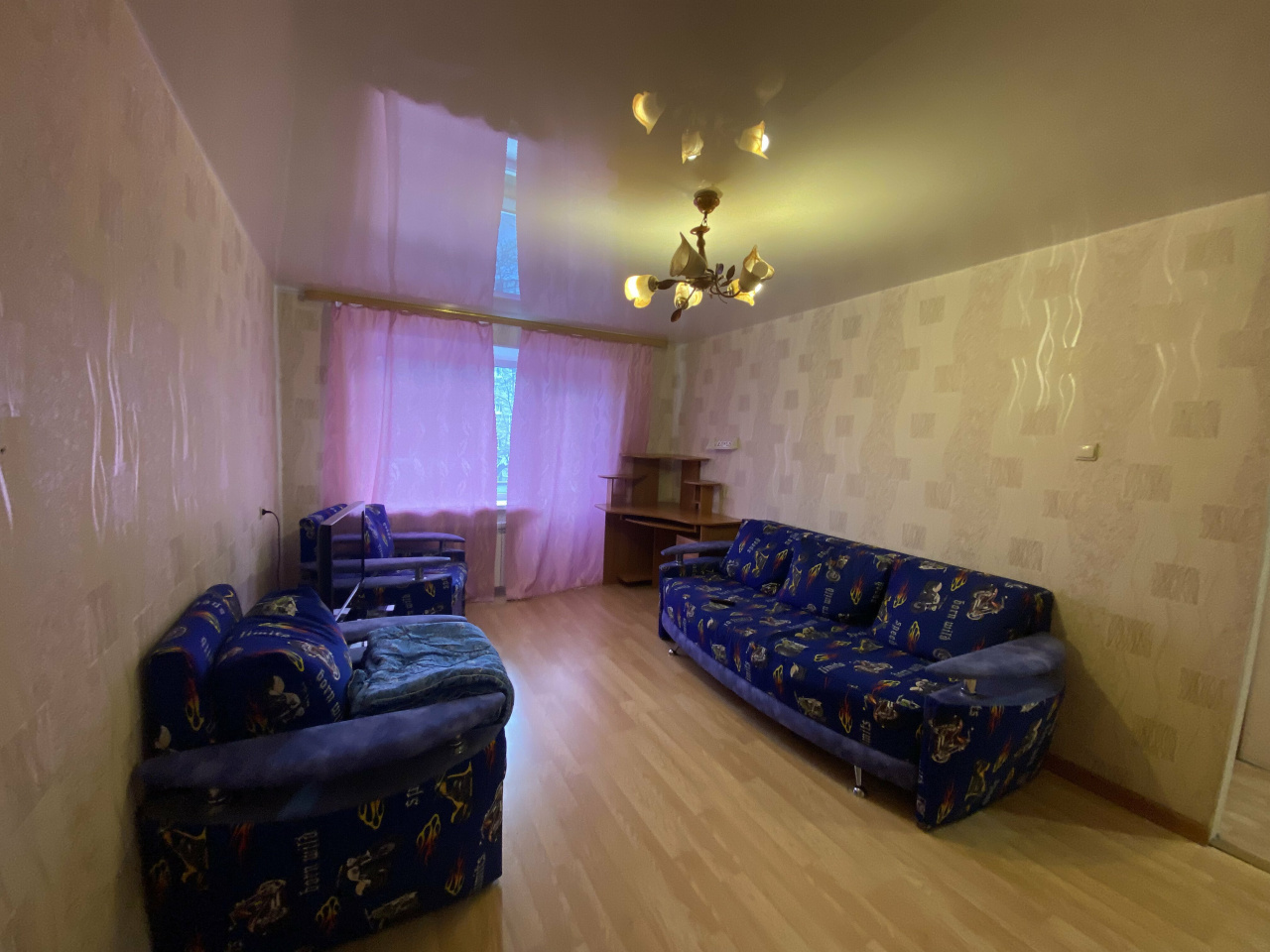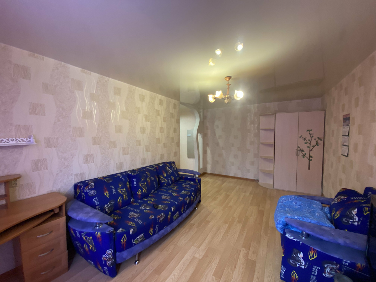 Из мебели в комнате большой шкаф, двухстворчатый, мягкая мебель, диван, 2 кресла, стеклянная тумба под телевизор, TV, компьютерный стол. В прихожей, модульная прихожая «Оскар», вешалка с полками, для обуви и головных уборов. В кухне, стол, холодильник, газовая плита, раскладной стол тумба, навесной шкаф. Санузел совмещенный, в кафеле, пол керамогранит с подогревом. В квартире окна ПВХ, батареи новые, потолок натяжной,на полу ламинат. Балкон. Сейф дверь. Состояние отличное.