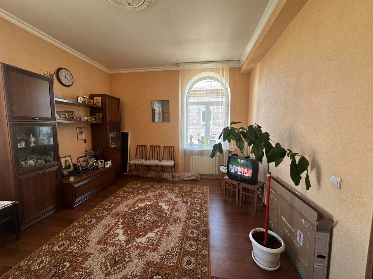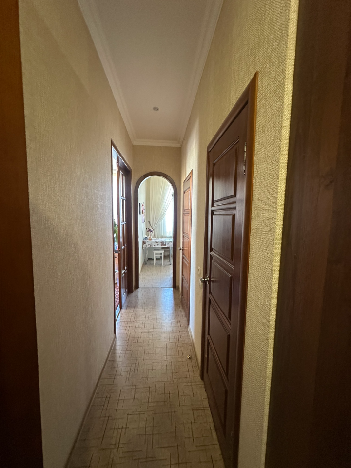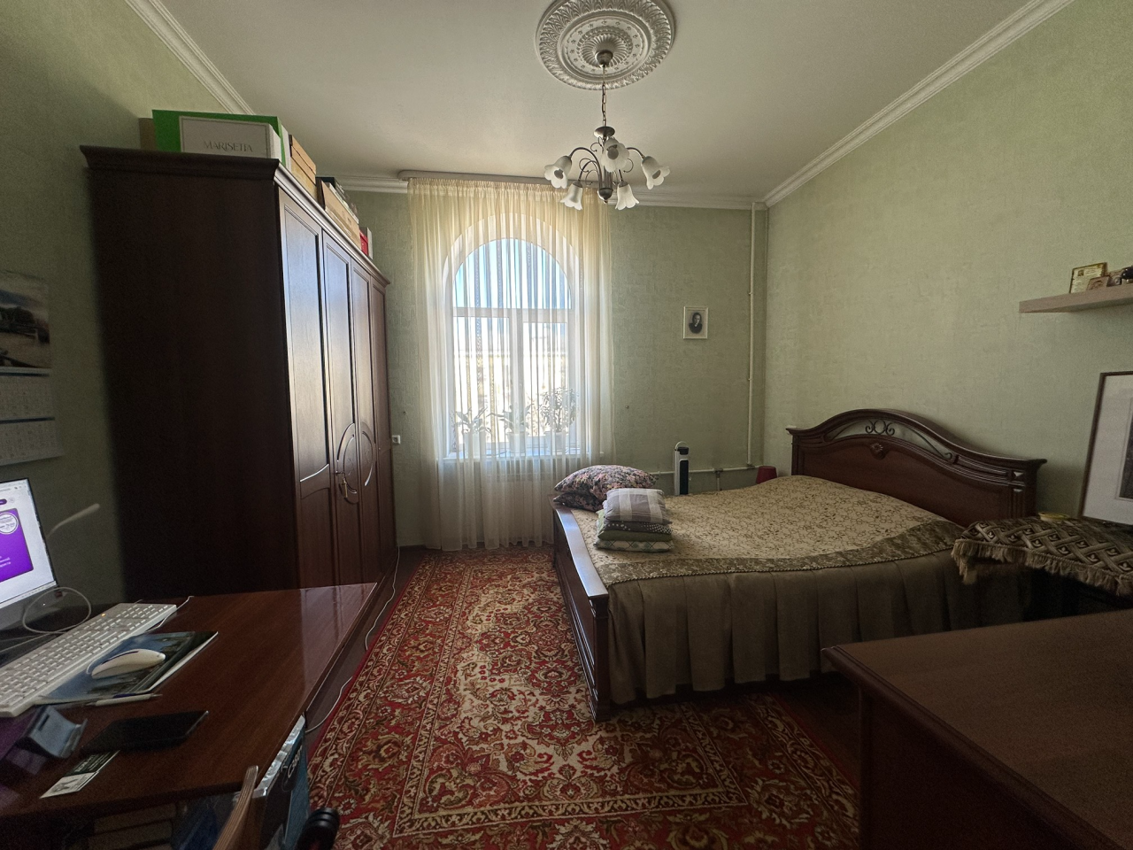 ? **Ремонт: ** стильный, в спокойных тонах обои, пол - ламинат, натуральные деревянные двери, высокие потолки 3,2 м.